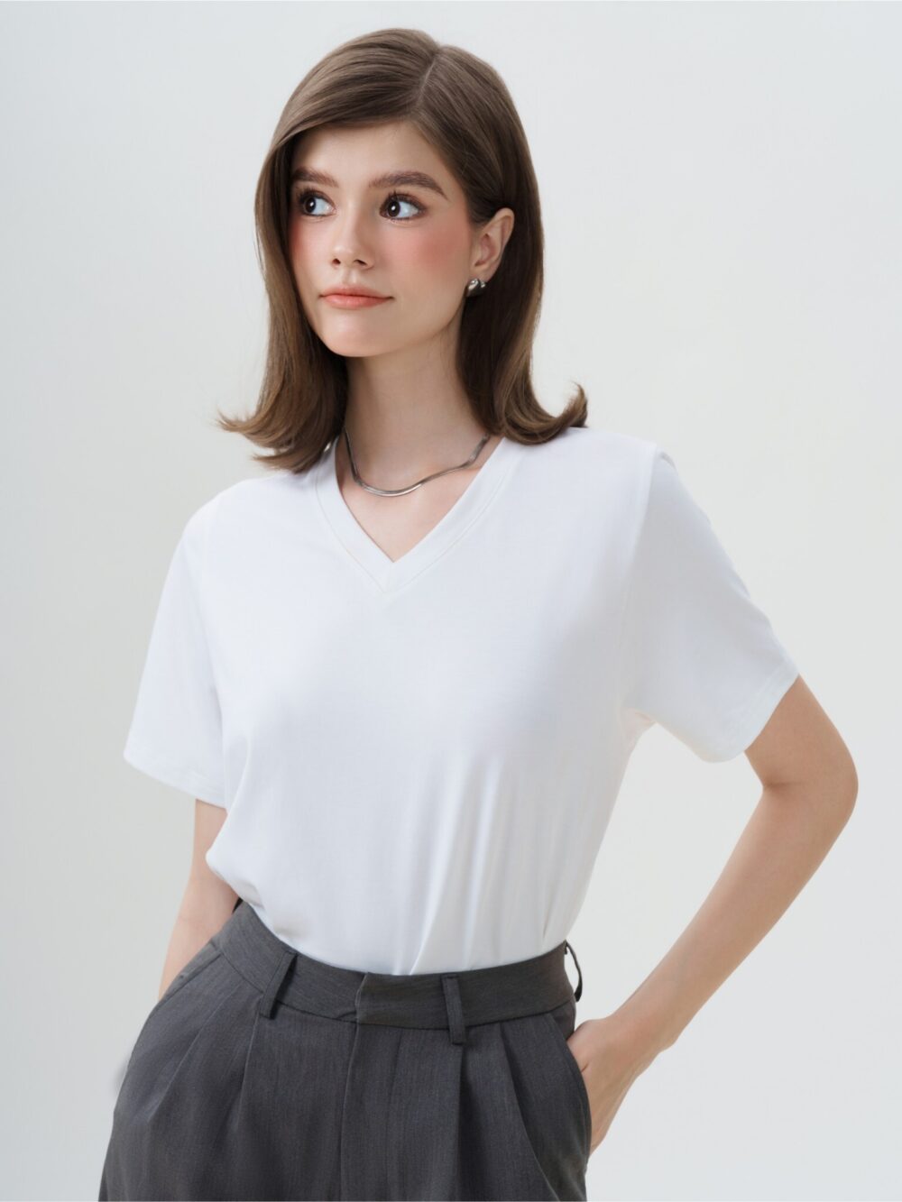 - Top Design: Classic white V-neck tee with a smooth, tailored fit